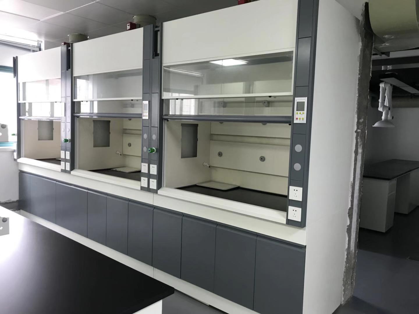 三塊導(dǎo)流板使處于不同高度空間的有害氣體分別從不同的段區(qū)排出。通風(fēng)柜以操作表面風(fēng)速0.5m/s的速度將通風(fēng)柜中的空氣排出,確保無(wú)任何殘留氣體存在。通風(fēng)效率高,排風(fēng)量為1600m3/h左右,且噪聲小。